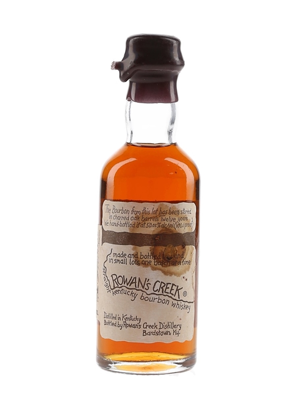 A miniature bottle of Rowan's Creek 12 Year Old Kentucky Bourbon, distilled and bottled by Rowan's Creek at 50.05% ABV.