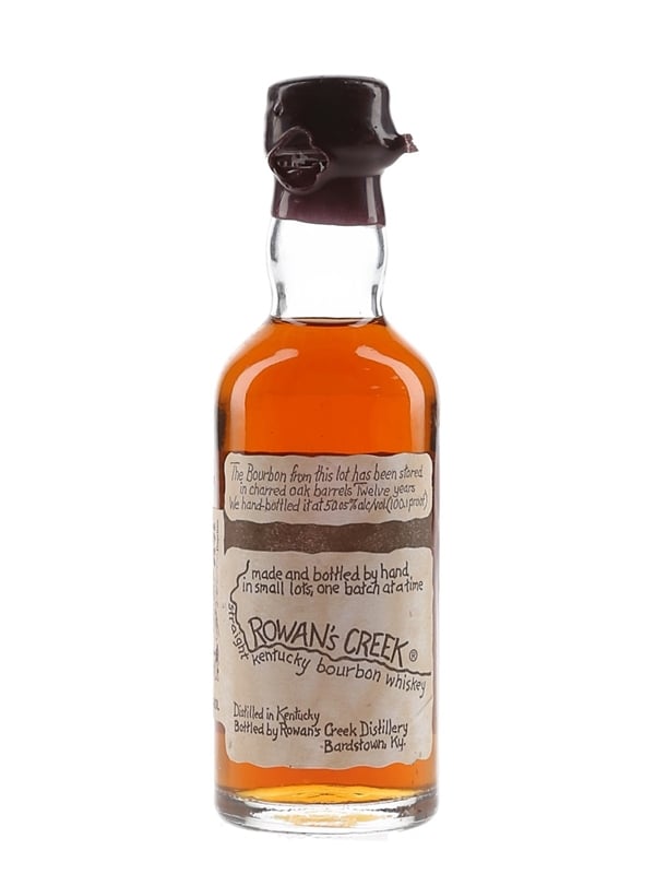 A miniature bottle of Rowan's Creek 12 Year Old Kentucky Bourbon, distilled and bottled by Rowan's Creek at 50.05% ABV.
