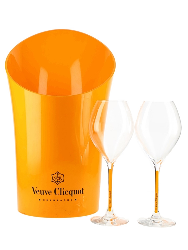 Veuve Clicquot Ice Bucket & Two Veuve Clicquot Glasses 3 x 21cm-38cm Tall