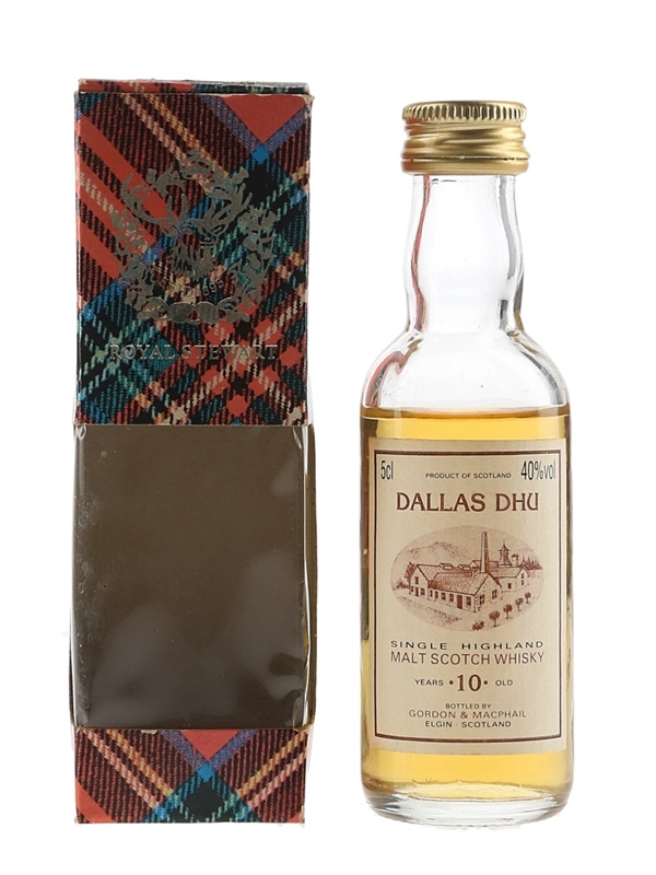 A miniature bottle of Dallas Dhu 10 Year Old Single Highland Malt Scotch Whisky bottled by Gordon & MacPhail. The bottling code indicates this was bottled in 1989.