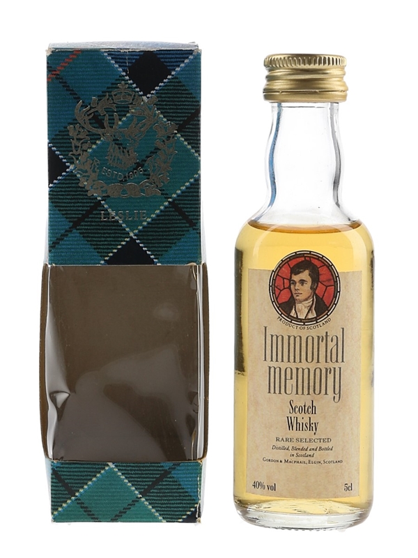 A miniature bottle of Immortal Memory Rare Selected Scotch Whisky bottled by Gordon & MacPhail.