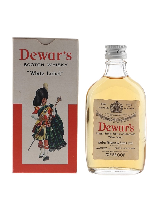 A miniature bottle of Dewar's White Label Fine Scotch Whisky, produced by John Dewar & Sons Ltd. We estimate this was bottled in the 1970s.