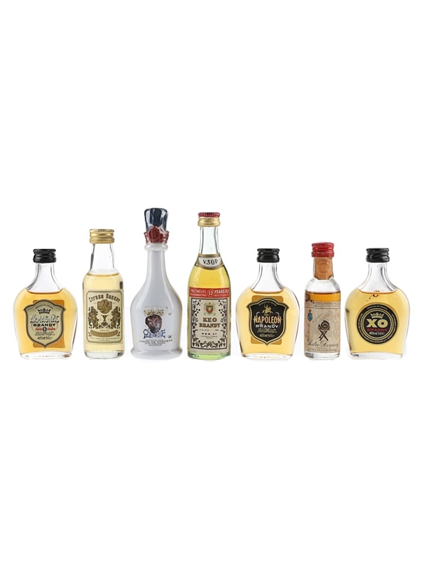 This lot contains seven miniature bottles of brandy produced in Spain, Cyprus and France. These include Pedro Domecq, Armagnac Brandy, Napoleon Brandy, XO Brandy, Cyprus Brandy, Keo Brandy and Osborne Brandy. We estimate these were bottled in the 1970s to 1980s.