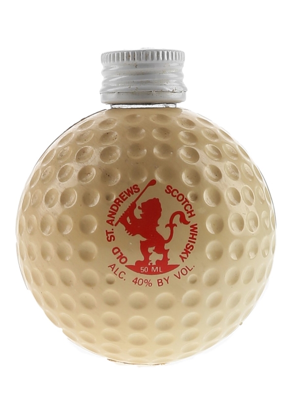 A miniature bottle of Old St Andrews Scotch Whisky, presented in a golf ball shaped bottle.