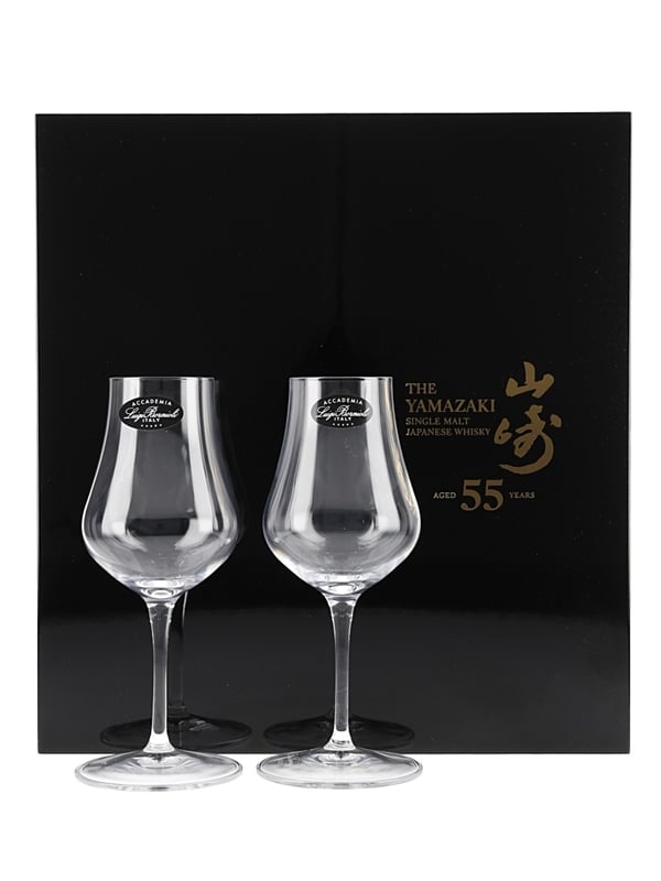A pair of Yamazaki 55 Year Old whisky tasting glasses, presented in wooden box with booklet. The tasting glasses are by Luigi Bormioli, and measure 16cm tall.