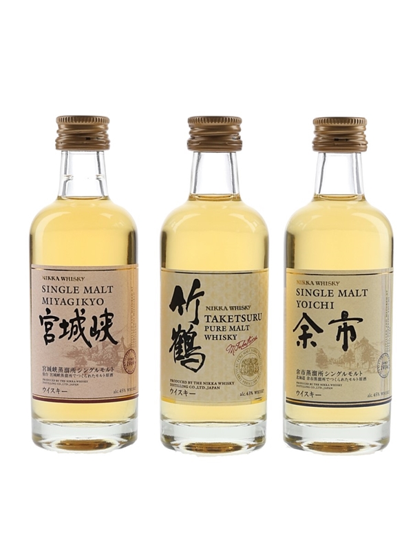 This lot contains three miniature bottles from Nikka including Yoichi Single Malt, Miyagikyo Single Malt and Taketsuru Pure Malt Whisky produced by The Nikka Whisky Distilling Co. Ltd.