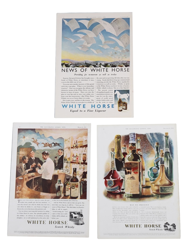 This lot contains three advertisements for White Horse Whisky from The Illustrated London News, dated 15 January 1944, 3 March 1951 and 6 December 1952. They measure approximately 36cm x 26cm.