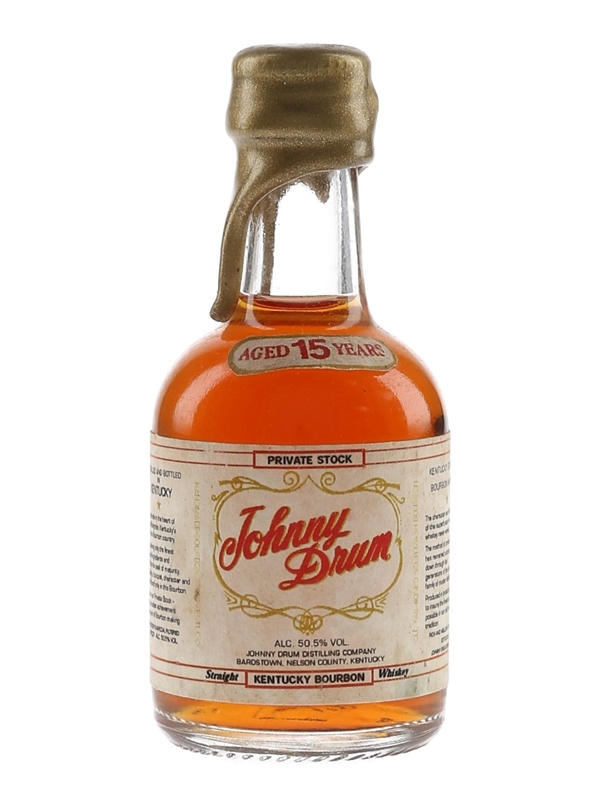 A miniature bottle of Johnny Drum 15 Year Old Private Stock Kentucky Straight Bourbon Whiskey.