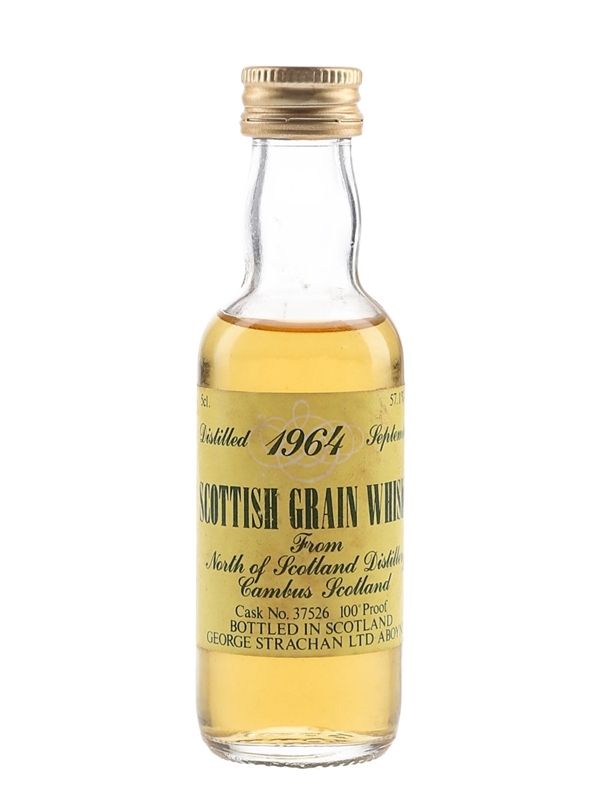 A miniature bottle of Scottish Single Grain Whisky distilled in September 1964 at North of Scotland Distillery, Cambus. This was bottled at 57.1% ABV by George Strachan Ltd.