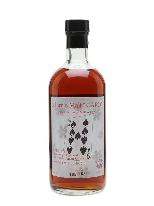 A bottle of Ichiro's Malt Nine of Spades, a 1990 vintage whisky from the now-closed Hanyu distillery. This was bottled in 2010 for the Card series after maturing in two different cask types - a hogshead and a cream sherry butt.