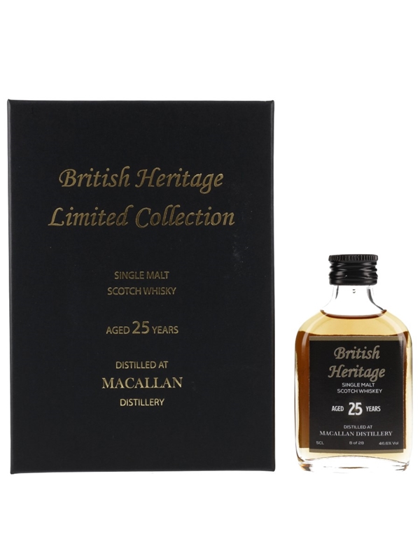A miniature bottle of Macallan 25 Year Old Single Malt Scotch Whisky, selected and bottled by Whisky Minis for the British Heritage Collection. This miniature is named Giants Causeway.