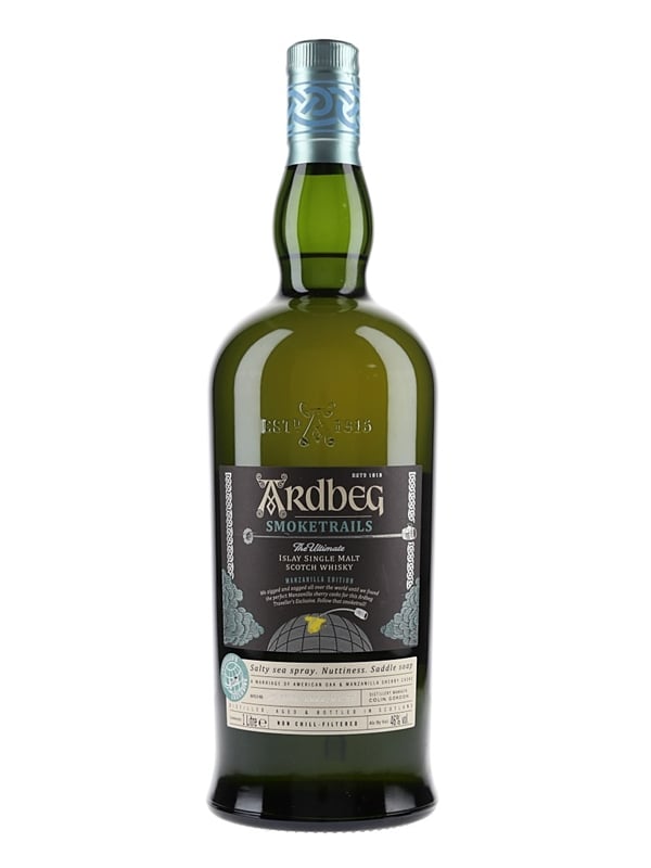A litre bottle of Ardbeg Smoketrails Islay Single Malt Scotch Whisky, a Traveller's Exclusive matured in American oak and Manzanilla sherry casks. This is from batch number SP/MZL: 2022/01-ST. This was released in 2022 and is the first expression in the Ardbeg Smoketrails series.
