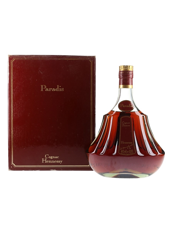 A bottle of Hennessy Paradis Cognac in a presentation box. This expression is created from some of Hennessy's oldest stocks, known as 'Paradis', stored in a separate cellar called 'Le Chai du Fondateur'. We estimate this was bottled in the 1970s to 1980s.