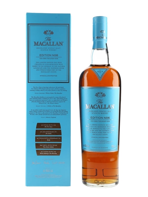 A bottle of The Macallan Edition No.6 Highland Single Malt Scotch Whisky, a limited edition matured in five distinct cask types and bottled at 48.6% ABV. This edition was created in collaboration with Hardy, a world renowned fly fishing brand, and supports the crucial conservation work of the Atlantic Salmon Trust.