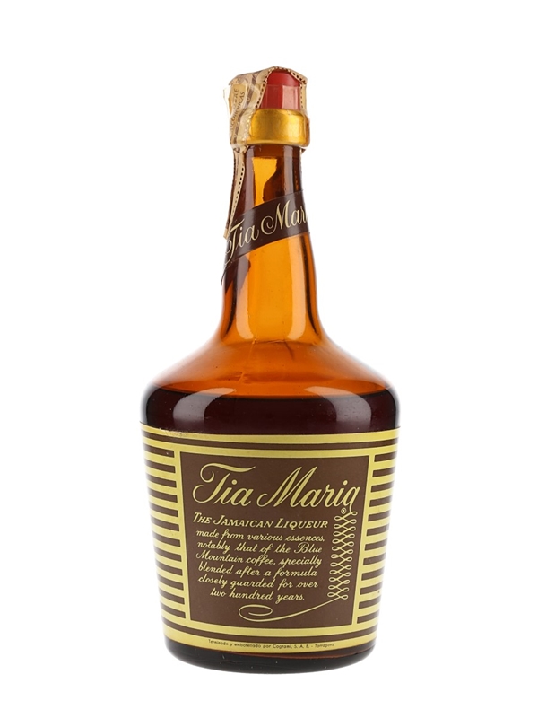 A bottle of Tia Maria, a Jamaican coffee liqueur produced by Estate Industries Ltd., Kingston. This was bottled in Spain by Tarragona, we estimate in the 1970s.