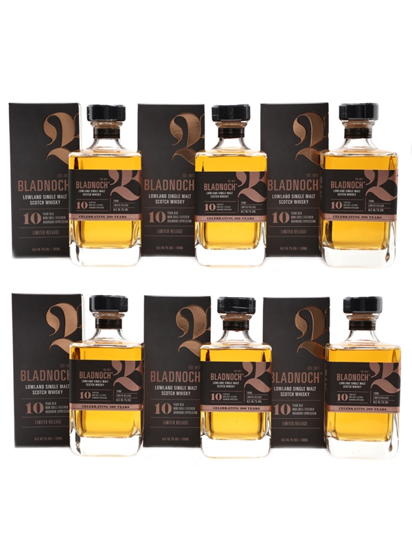 This lot contains six bottles of Bladnoch 10 Year Old Lowland Single Malt Scotch Whisky in the original packaging. This bourbon matured expression was one of the distillery's first releases since coming under new ownership in 2015.