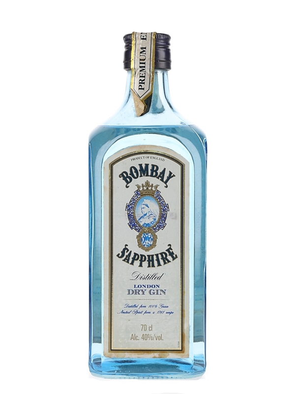 A bottle of Bombay Sapphire Distilled London Dry Gin. This was made from neutral grain spirit to a 1761 recipe, with a blend of ten carefully selected botanical ingredients. We estimate this was bottled in the 1990s.