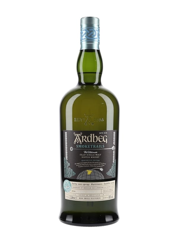 A litre bottle of Ardbeg Smoketrails Islay Single Malt Scotch Whisky, a Traveller's Exclusive matured in American oak and Manzanilla sherry casks. This is from batch number SP/MZL: 2022/01-ST.