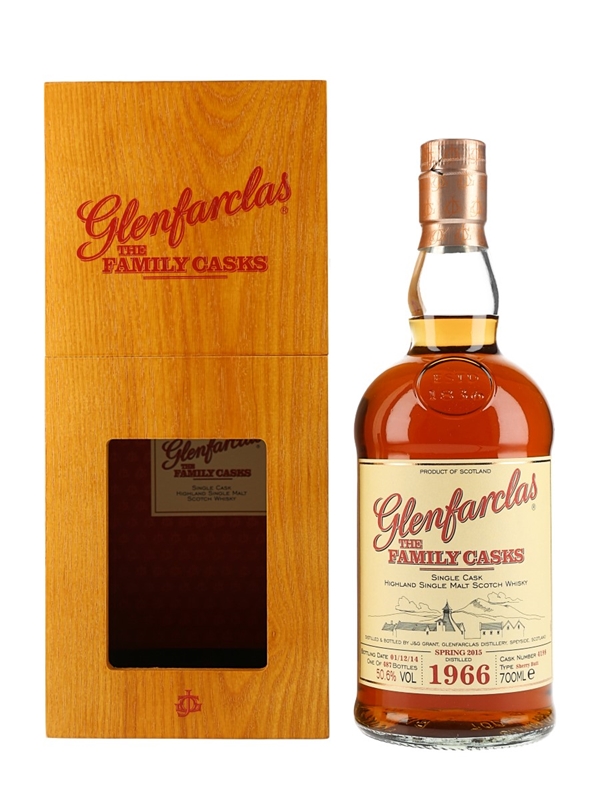 A bottle of Glenfarclas 1966 The Family Casks Single Cask Highland Malt Scotch Whisky. This was distilled in 1966, matured in a sherry butt and bottled on 1 December 2014.