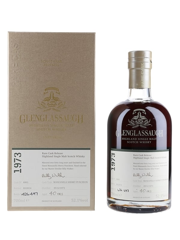 A bottle of Glenglassaugh 40 Year Old Rare Cask Release Highland Single Malt Scotch Whisky. This was distilled on 5 December 1973, finished in a Manzanilla Sherry Puncheon and bottled at 52.1% ABV in February 2014 as a Rare Cask Release.