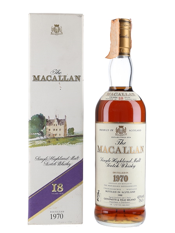 A bottle of The Macallan 18 Year Old Single Highland Malt Scotch Whisky. This was distilled in 1970, matured in sherry casks and bottled in 1988. This was bottled for the Italian market and imported by Giovinetti.