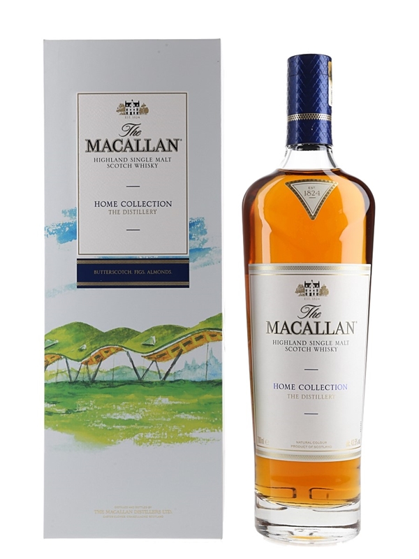 A bottle of The Macallan Home Collection The Distillery Single Malt Scotch Whisky. This is the first in the Home Collection series.