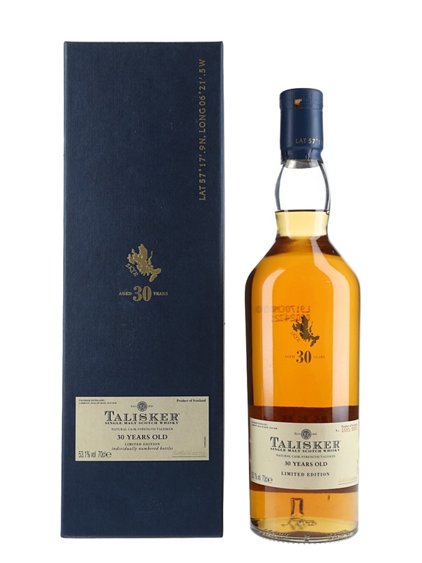 A bottle of Talisker 30 Year Old Single Malt Scotch Whisky. This was bottled at natural cask strength for Diageo's Special Releases in 2009.