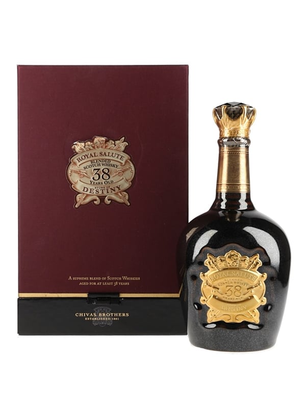 A bottle of Royal Salute 38 Year Old Blended Scotch Whisky produced by Chivas Brothers Ltd. This was named Stone of Destiny as a tribute to the ancient stone used for centuries at British Royal coronation ceremonies to symbolise the approval for the incoming monarch.