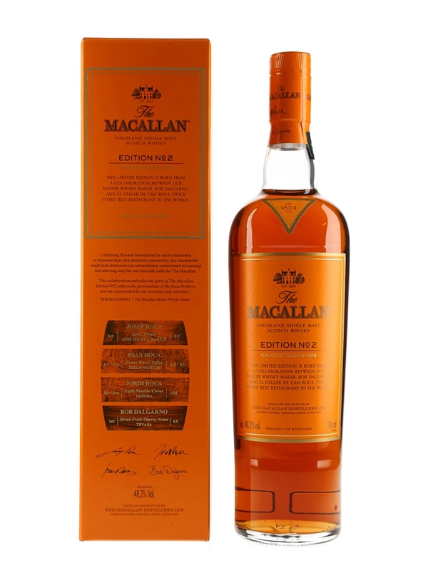 A bottle of The Macallan Edition No.2 Highland Single Malt Scotch Whisky bottled at 48.2% ABV. This is a limited edition matured in four distinct cask types selected by master blender Bob Delgarno and Spanish chefs Joan, Josep and Jordi Roca from El Celler de Can Roca. The restaurant was twice voted best restaurant in the world.