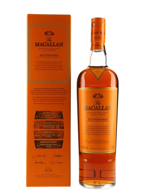 A bottle of The Macallan Edition No.2 Highland Single Malt Scotch Whisky bottled at 48.2% ABV. This is a limited edition matured in four distinct cask types selected by master blender Bob Delgarno and Spanish chefs Joan, Josep and Jordi Roca from El Celler de Can Roca. The restaurant was twice voted best restaurant in the world.