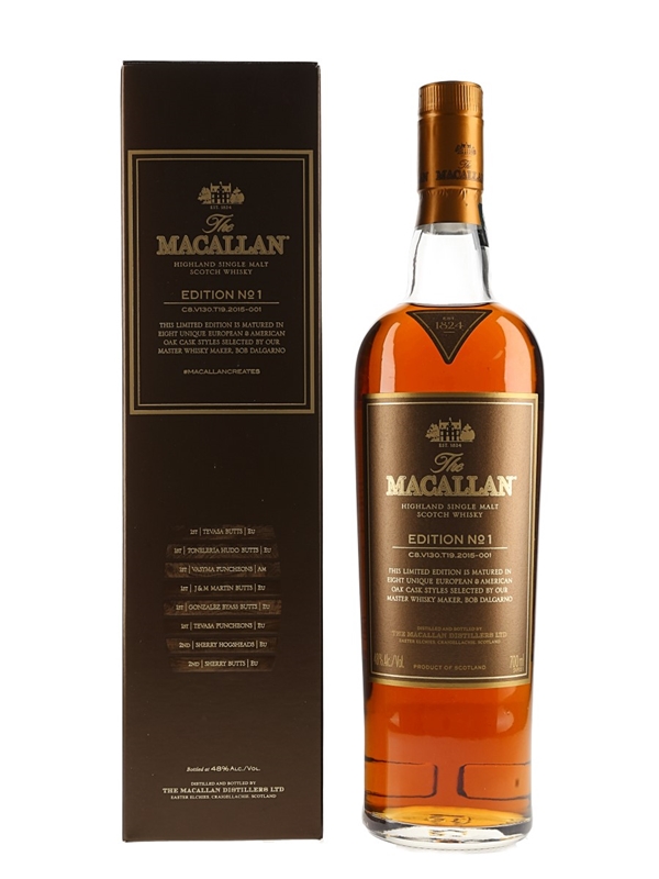 A limited edition bottle of The Macallan Edition No.1 Highland Single Malt Scotch Whisky. This was made from a combination of eight types of American and European oak matured whiskies, bottled at 48% ABV.