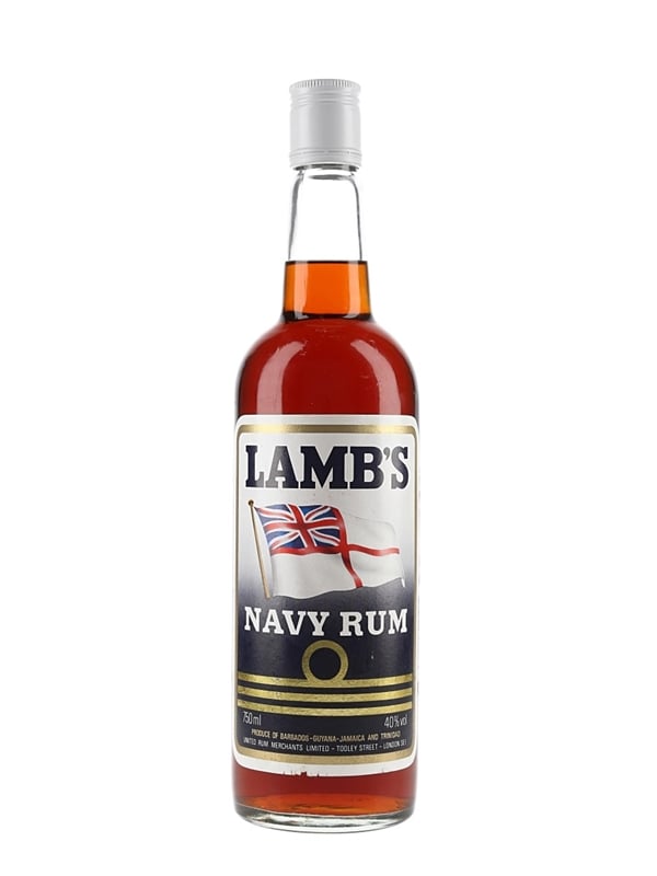 A bottle of Lamb's Navy Rum, blended and bottled by United Rum Merchants from rum produced in Barbados, Guyana, Jamaica and Trinidad. We estimate this was bottled in the 1980s.