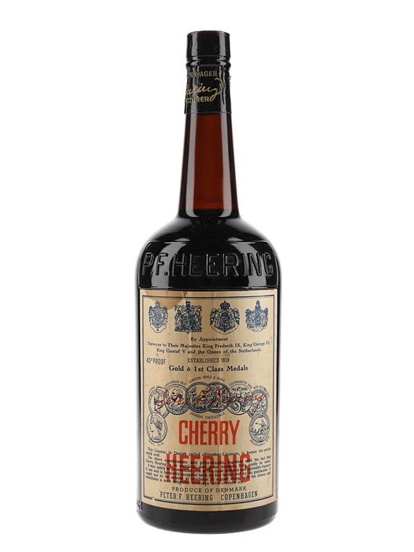 A bottle of Cherry Heering liqueur produced by Peter F Heering in Copenhagen, Denmark. We estimate this was bottled in the 1940s.