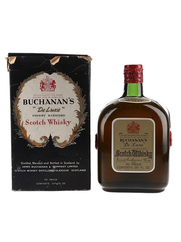 A bottle of Buchanan's De Luxe Finest Blended Scotch Whisky, sealed with a spring cap closure. This was distilled, blended and bottled by the proprietors of Black & White Scotch Whisky, James Buchanan & Co. Limited. We estimate this was bottled in the 1950s to early 1960s.