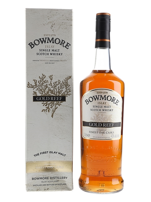 A litre bottle of Bowmore Gold Reef, Single Malt Scotch Whisky matured in finest oak casks. This was bottled for travel retail stores.