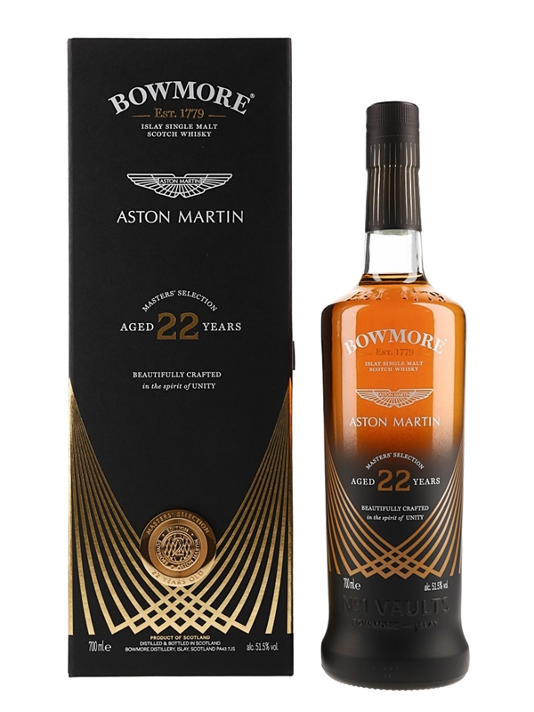 A bottle of Bowmore 22 Year Old Aston Martin Masters' Selection Islay Single Malt Scotch Whisky made in collaboration with Aston Martin.