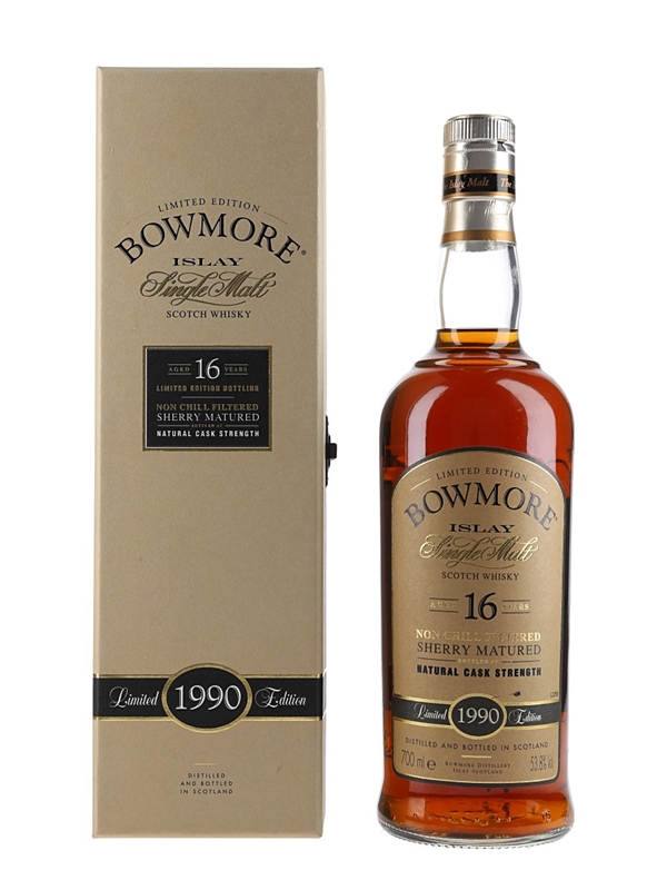 A limited edition bottle of Bowmore 1990 Islay Single Malt Scotch Whisky, a marriage of 39 sherry casks bottled at a natural cask strength of 53.8% after 16 years of maturation.
