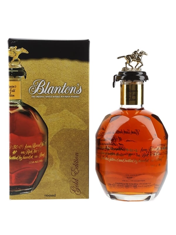 A bottle of Blanton's Gold Edition Kentucky Straight Bourbon Whiskey, imported to the UK by Gordon & MacPhail. The label reads: Dumped on 7-21-21, From Barrel No. 687, Stored in Warehouse H, on Rick No. 34. This is bottle number 256.