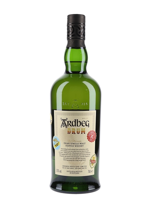 A bottle of Ardbeg Drum Islay Single Malt Scotch Whisky, the Ardbeg Committee Only Edition of 2019. This was matured in ex-bourbon casks and finished in rum casks.