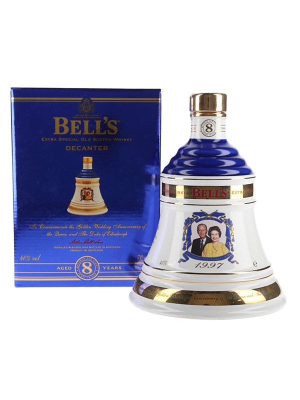 A bottle of Bell's 8 Year Old Extra Special Old Scotch Whisky presented in a Wade porcelain decanter, released in 1997 to celebrate the Golden Wedding Anniversary of Queen Elizabeth II and the Duke of Edinburgh.