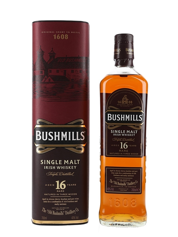 A bottle of Bushmills 16 Year Old Single Malt Irish Whiskey. This was matured in three distinct cask types: American oak, oloroso sherry casks and port pipes.