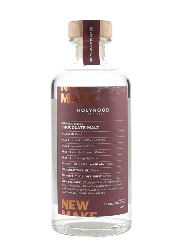 A bottle of Holyrood Chocolate Malt New Make Spirit produced by Holyrood Distillery in the Lowland region of Scotland.