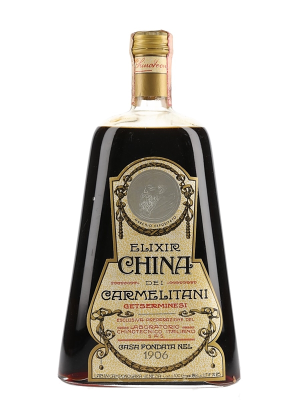 A litre bottle of Carmelitani Elixir China liqueur from Italy. We estimate this was bottled in the 1960s to 1970s.