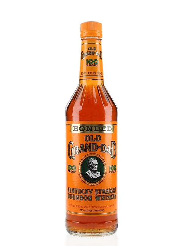 A bottle of Old Grand-Dad 100 Proof Kentucky straight bourbon whiskey. This was distilled and bottled in bond by The Old Grand-Dad Distillery Co., Frankfort.