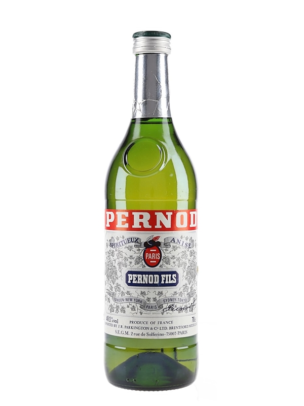 A bottle of Pernod Fils Spiritueux Anise produced in France. This was bottled for the UK market and imported by J R Parkington, we estimate in the 1980s.