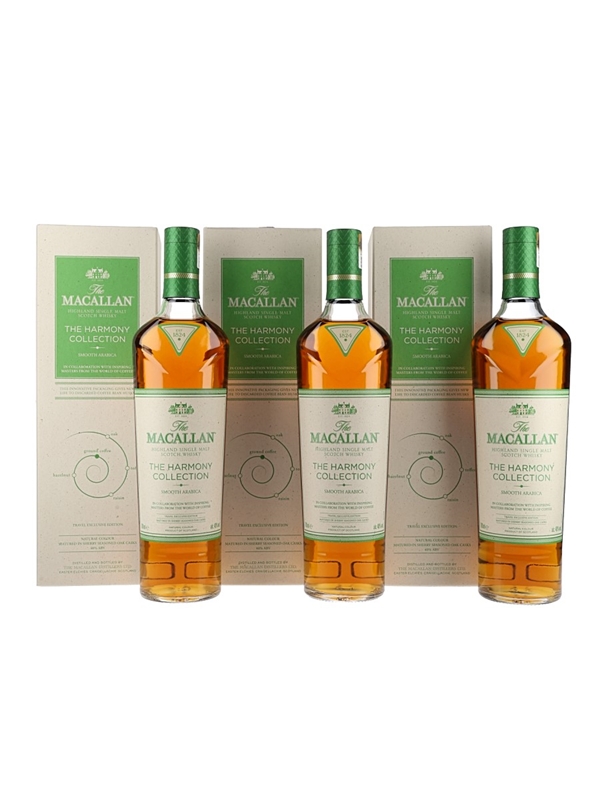 This lot contains three bottles of The Macallan Smooth Arabica Highland Single Malt Scotch Whisky from The Harmony Collection. This is inspired by the Ethiopian Arabica bean, in collaboration with inspiring masters from around the world of coffee.