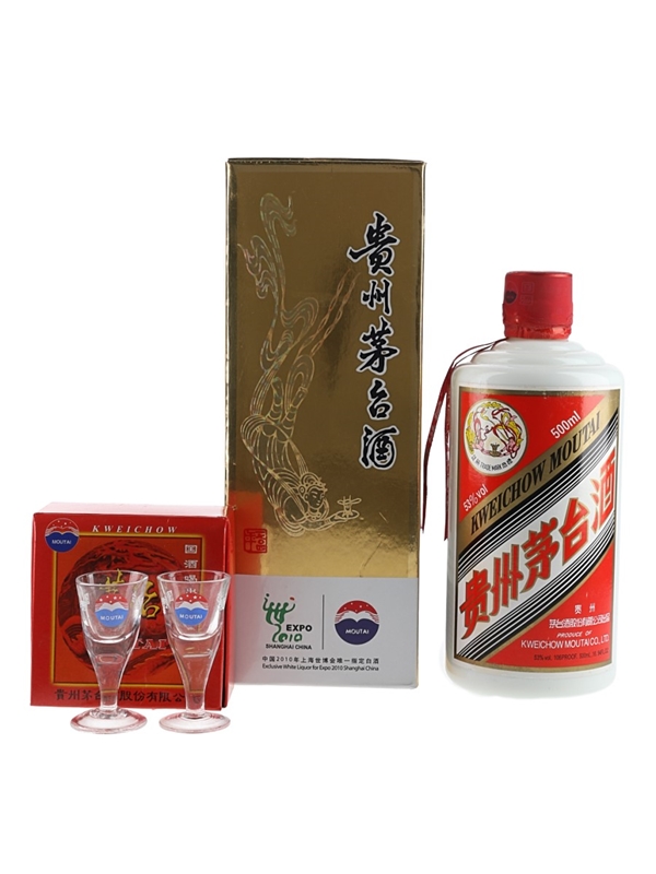 A 50cl bottle of Kweichow Moutai 2011 with a pair of miniature shot glasses.