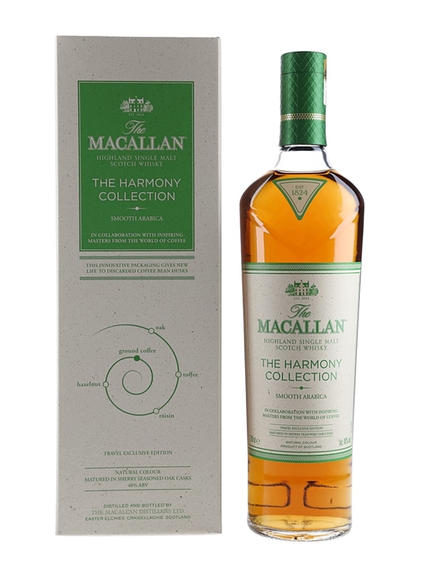 A bottle of The Macallan Smooth Arabica Highland Single Malt Scotch Whisky from The Harmony Collection. This is inspired by the Ethiopian Arabica bean, in collaboration with inspiring masters from around the world of coffee.
