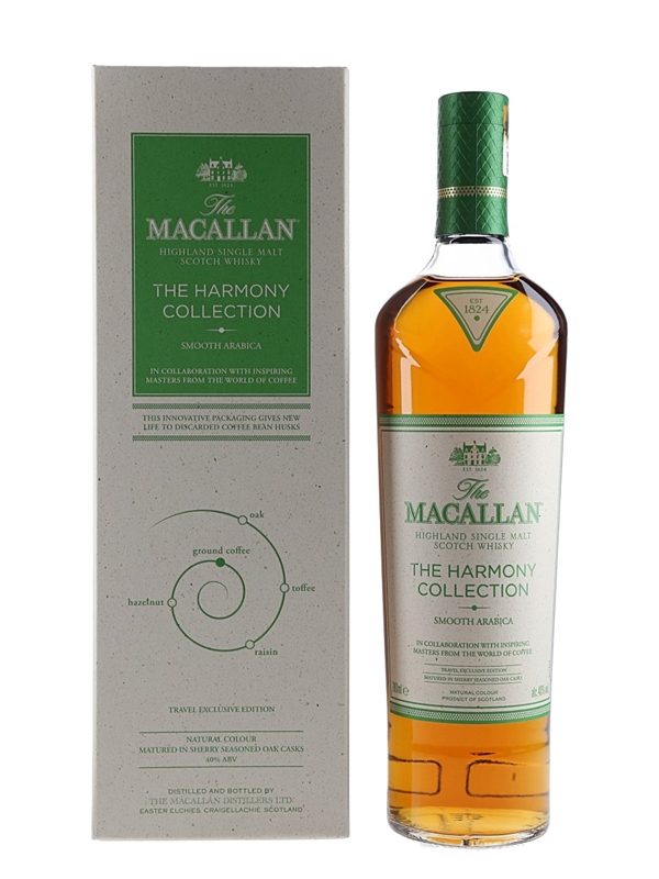 A bottle of The Macallan Smooth Arabica Highland Single Malt Scotch Whisky from The Harmony Collection. This is inspired by the Ethiopian Arabica bean, in collaboration with inspiring masters from around the world of coffee.