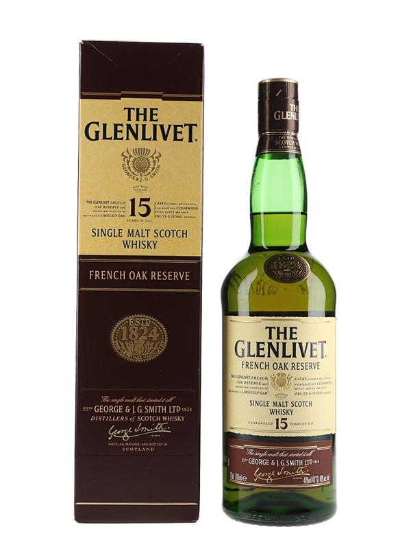 A bottle of The Glenlivet 15 Year Old French Oak Reserve Single Malt Scotch Whisky produced by George & J.G. Smith and distributed in the UK by Pernod Ricard. The bottling code indicates this was bottled on 21 December 2010.